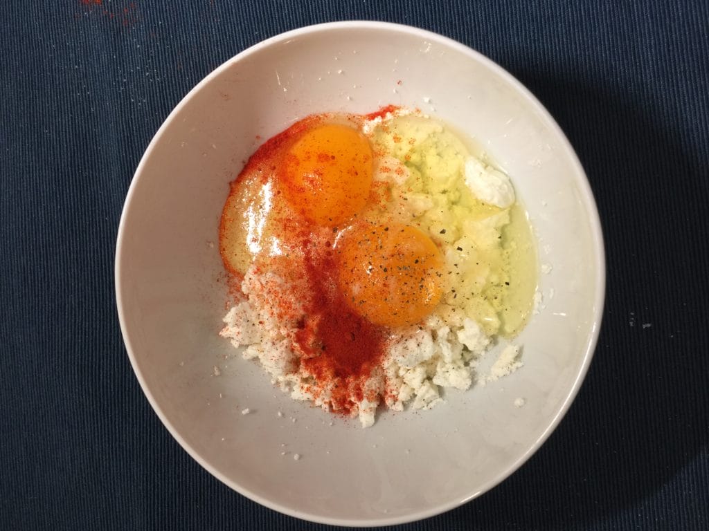- Add eggs, pinch of salt if feta is not salty enough (be careful, pancetta is salty too!), pinch of pepper, red paprika and pancetta (leave some pancetta to sprinkle on top).