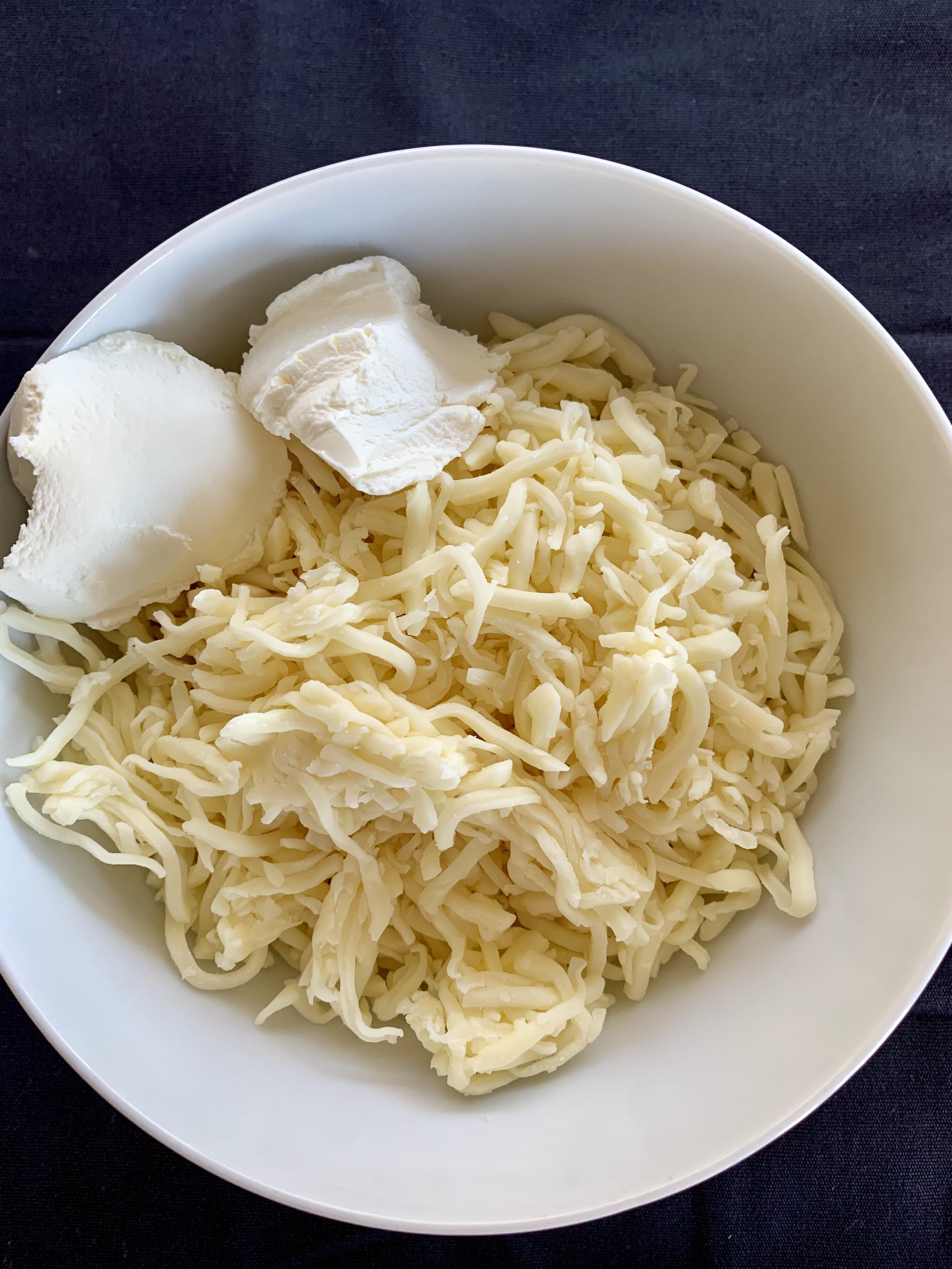 - Take mozzarella and cream cheese and put it for 30 sec in microwave or melt in in a double boiler.