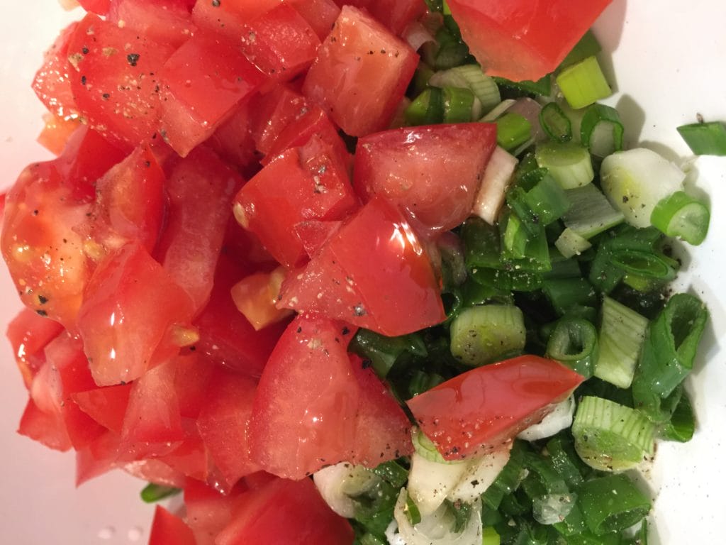 Prepare salsa. Cut spring onion and cherry tomato and season it with salt, pepper, cider vinegar and toasted sesame oil.